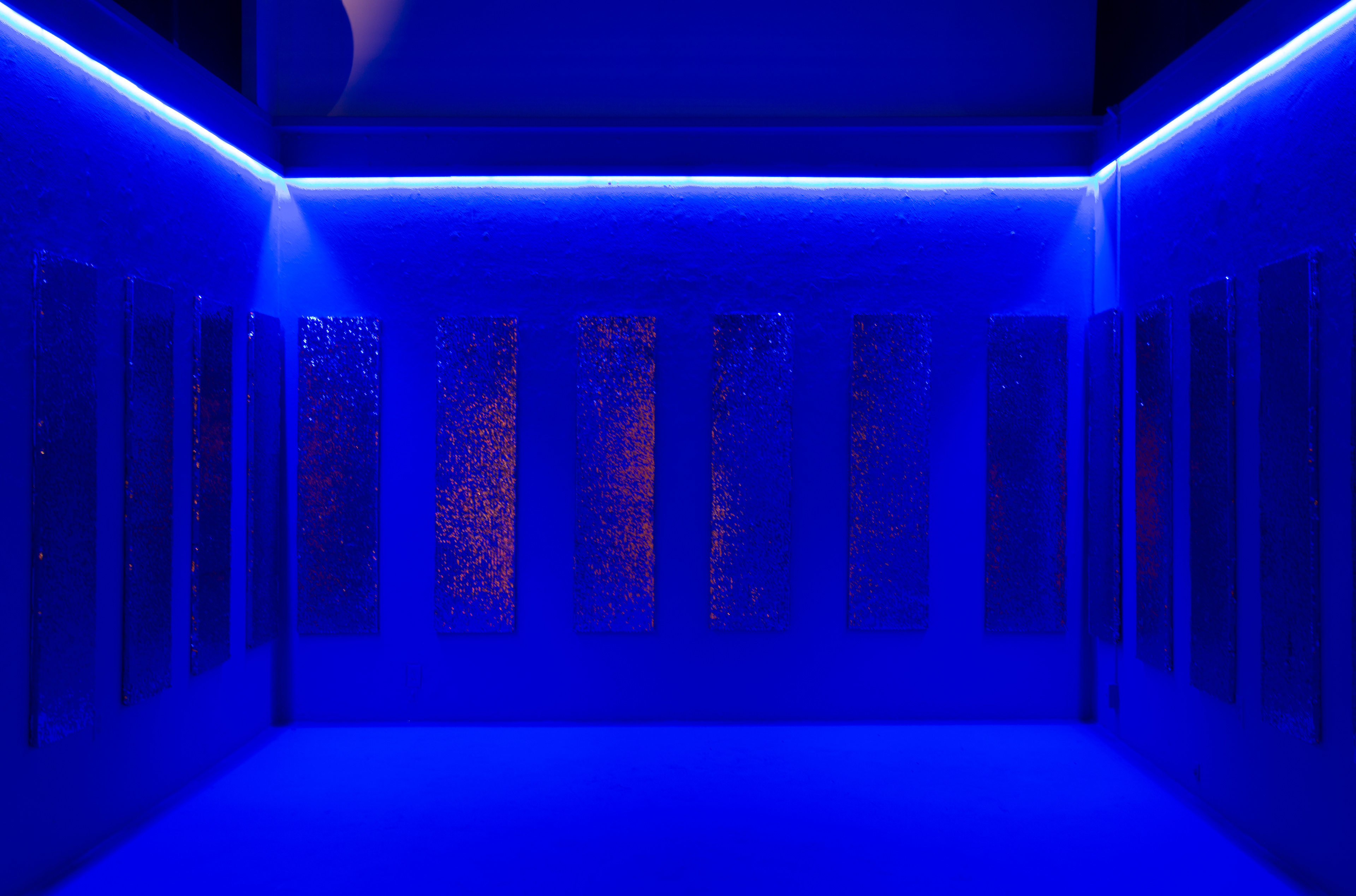 My Personal Soundtrack. 2017. Sequins, disco ball, pin spot lights, wood, installation foam, silver tape, audio. Installation (Hallway Size: 30 x 5 x 12 feet).